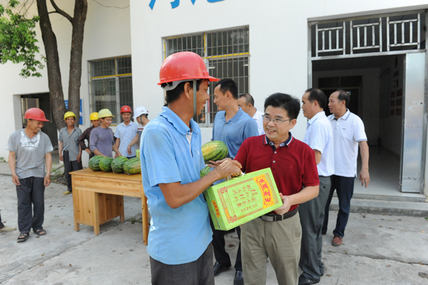 8月23日下午,医院党委书记韦义甜、党委副书记、纪委书记韦克波、副院长唐秀革以及工会主席黄天国等领导分别率队前往急诊科、司机班、保安组、水电班及儿科中心和中山路住宅小区项目工地进行送清凉慰问活动。慰问组给一线工作人员送去了西瓜、王老吉饮料等解暑品,并向他们致以亲切的问候。在现场,韦义甜书记一一将防暑降温用品送到施工人员手中,对他们头顶烈日、坚守岗位、一丝不苟的工作态度表示衷心的感谢和崇高的敬意,同时叮嘱他们要注意防暑,注意施工安全。