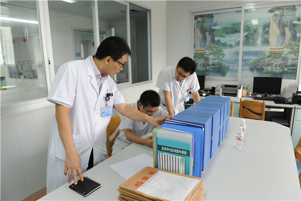 现场技术评估包括血液透析室扩大工作汇报、实地评估和检查反馈三个环节。首先,由肾内科蒙如庆主任就医院血液透析室扩大配备的人员、设备、场地等基本情况进行了简要介绍。随后专家组仔细查看了血液净化室台账、培训记录、患者治疗记录等资料,并抽查了医护人员对血液净化相关知识的掌握情况。反馈会上,专家组对我院血液透析室规模扩大工作的开展情况表示赞赏和肯定,并宣布医院通过现场技术评估。