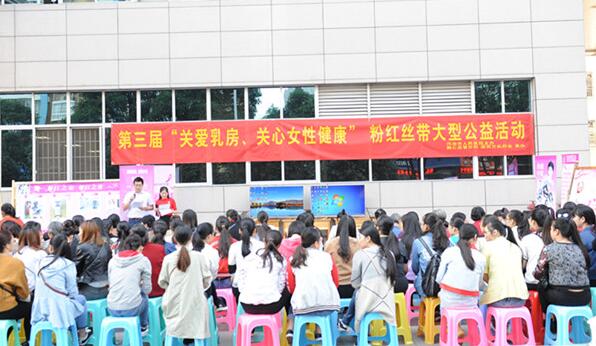 11月19日,我院胸心血管外科在医院门诊综合大楼前,举行了别开生面的“关爱乳房 关心女性健康”粉红丝带公益活动,向市民普及乳腺疾病知识,呼吁社会各界共同关注女性乳房健康。来自全市的乳腺癌患者、医务工作者及志愿者近100人参加了活动,他们在活动上互相交流、分享经验、传递爱心、感受快乐。