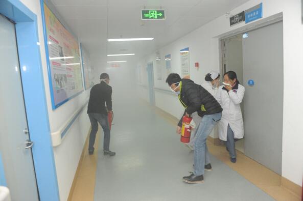演练现场,消防队员立即拉起警戒线,火场侦察、水带铺设等工作也迅速有序展开。参加演练的人员也迅速做出反应,立即将病房内的病人进行紧急转移,他们用湿毛巾捂住口鼻,在消防官兵的指挥下,快速有序地从火区撤离,疏散至安全地。在现场指挥部,设置了图像实时传输的方式,可将内部救援情况第一是时间传输到现场指挥部,给现场指挥部提供视频画面,为作战指挥提供有力依据。同时我院的医务人员及安保人员在现场指挥共同观看演练情况。