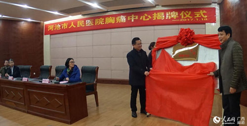 1月18日上午,河池首个胸痛中心在市人民医院正式挂牌成立,市卫生计生委领导、该院领导班子成员及桂西北医院联盟成员单位共同为胸痛中心揭牌。当天,市人民医院还正式启动了河池首个脑卒中中心的建设工作。