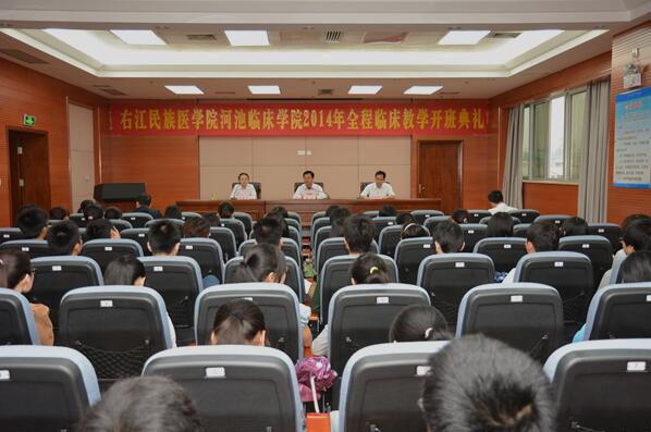 近日,右江民族医学院河池临床学院全程临床教学开班典礼在医院门诊综合楼五楼学术报告厅举行,河池临床学院院长梁涛、科教科科长蒙如庆出席了开班典礼,医学影像学、神经内科学、外科学、妇产科学教研室的部分科任老师以及右江民族医学院2011级临床本科8班61名同学参加。开班典礼由河池临床学院教务部部长梁惠芳主持。