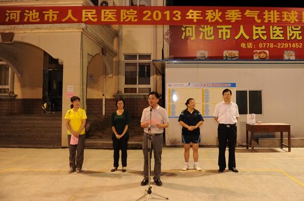 梁涛院长在致辞中,对组织此次比赛的工作人员的辛勤工作表示了感谢。他指出,近年来,医院坚持“病人至上,人文关怀;质量第一,费用合理”的服务理念,通过狠抓医疗质量建设,强化内涵建设,医院发展步子越走越快,2013年是我院各项工作能否迈上新台阶、踏上新征程、实现新跨越的关键之年,举办全院职工广泛参与的气排球比赛,不仅是为增强职工体质,活跃医院文化,更是为了激发全院职工“团结进取、奋发向上、顽强拼搏、奋勇争先”的热情,激励他们积极发扬医院精神,弘扬体育精神,以昂扬的斗志、火热的激情投入到医院发展建设过程中去,投入到三级综合复评工作中去,为科室争光,为医院添彩。并预祝大家取得好成绩。