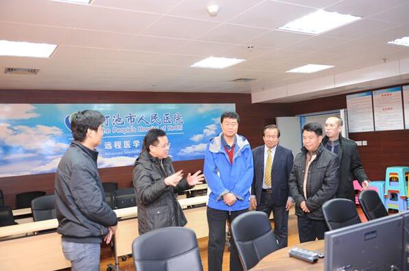 尤副厅长一行在院长梁涛等领导的陪同下,参观了我院远程会诊中心、信息机房、联盟客户服务中心等地方。在听取梁涛院长对“桂西北医院联盟”各项工作开展情况、下一年度工作设想的汇报后,尤副厅长高度肯定了我院积极响应国家医药卫生体制改革要求,倡导成了基层医疗联合体,切实提高基层医疗服务能力等方面的创新办法和探索精神。他要求联盟单位要不断总结经验,积极探索团结协作、合作共赢多模式,并对联盟工作提出以下参考意见:进一步加快信息化建设步伐,整合联盟单位医疗资源,尽快通畅双向转诊、会诊渠道;加大人才交流和培养力度,实现联盟人力资源的充分利用和整体水平的快速提高;加强联盟文化建设,统一发展意识、服务意识和价值观,真正将联盟拧成一股绳;保持现有的联盟规模,要注意保持地区医疗发展的差异性和多样性。市卫生局韦东禄局长也表示,将从政策方面引导联盟规划和发展,积极探索城乡多点执业具体办法。