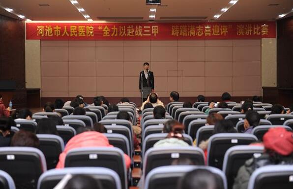 为进一步激发全院干部职工的思想和行为,增强全力以赴“创三甲”的责任感和使命感,近日来我院举办了“全力以赴战三甲、踌躇满志喜迎评”为主题的演讲比赛。比赛共有64人报名参加,经过两个下午的初赛,选出前14名选手进入决赛。