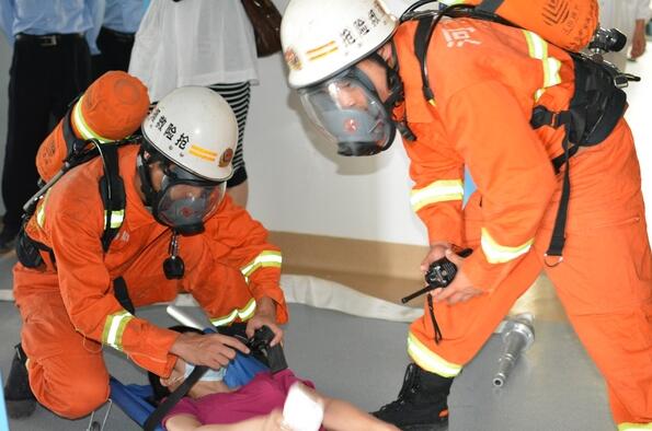 下午3:00,门诊综合大楼9楼病房突然冒起的滚滚浓烟,四辆消防车迅速驶入医院,随后,消防队员立即拉起警戒线,火场侦察、水带铺设等工作也迅速有序展开。参加演练的人员也迅速做出反应,立即将病房内的病人进行紧急转移,他们用湿毛巾捂住口鼻在消防官兵的指挥下,迅速有序地从火区撤离,疏散至安全地。于此同时,全副武装的抢险队员利用登高平台消防车成功伸到9楼窗口位置,将人员顺利救下。整个历时近1个小时,消防演练顺利完成。