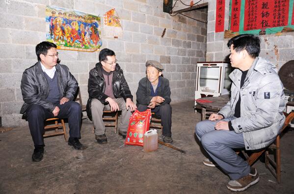 梁涛院长一行刚到兰包村就立即深入崔民梅(婆)102岁、覃壁堂(媳)78岁家中,现场与特困村民及困难党员进行座谈,了解他们的住宿以及生活困难情况。并为他们送去食用油、大米以及慰问金,表达春节的慰问和祝福。
