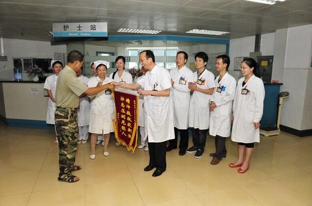 该患者为了表达对我院中医内科全体医务人员的感激之情,特赠送了“精神援救获新生,壮士压倒无能人”的锦旗。他说,我相信你们医务人员是以科学的理念去战胜各种各样的疑难杂症,想尽一切办法为病人排忧解难,以丰富的医学知识让患者转危为安,以忘我劳动精神,鼓舞患者与病魔做斗争,以至善至美的形象永驻患者的心田。