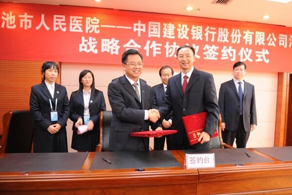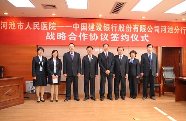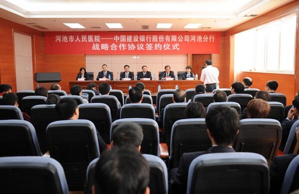11月2日,我院与中国建设银行河池分行在门诊综合大楼五楼学术报告厅签署全面战略合作协议。根据《协议》内容,双方将建立更加紧密、稳定的合作关系,开展以“健康龙卡”为重点的全方位的合作,实现合作共赢。