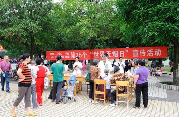 2012年5月31日是第25个世界无烟日,今年世界无烟日的主题是“烟草业干扰控烟”,口号是“生命与烟草的对抗”。为提高公众对吸烟危害健康的认识,营造科学健康的生活风尚,我院组织医疗专家共20余人在街心花园广场开展了以“烟草业干扰控烟”为主题的宣传教育、义务咨询和免费义诊活动。