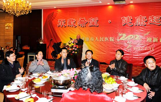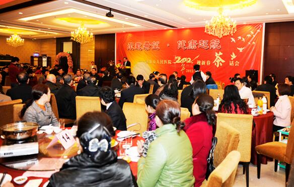 1月11日,我院在河池市锦都国际大酒店举行2012年迎春茶话会,河池市人民政府副秘书长陈爱萍出席了会议。参加茶话会的还有我院全体社会监督员、市直有关单位、市第三人民医院、各县(市)区卫生局、新农合办以及部分乡镇卫生院的领导;医院院领导班子成员和全体中层干部以及医院离退休人员代表约400人。