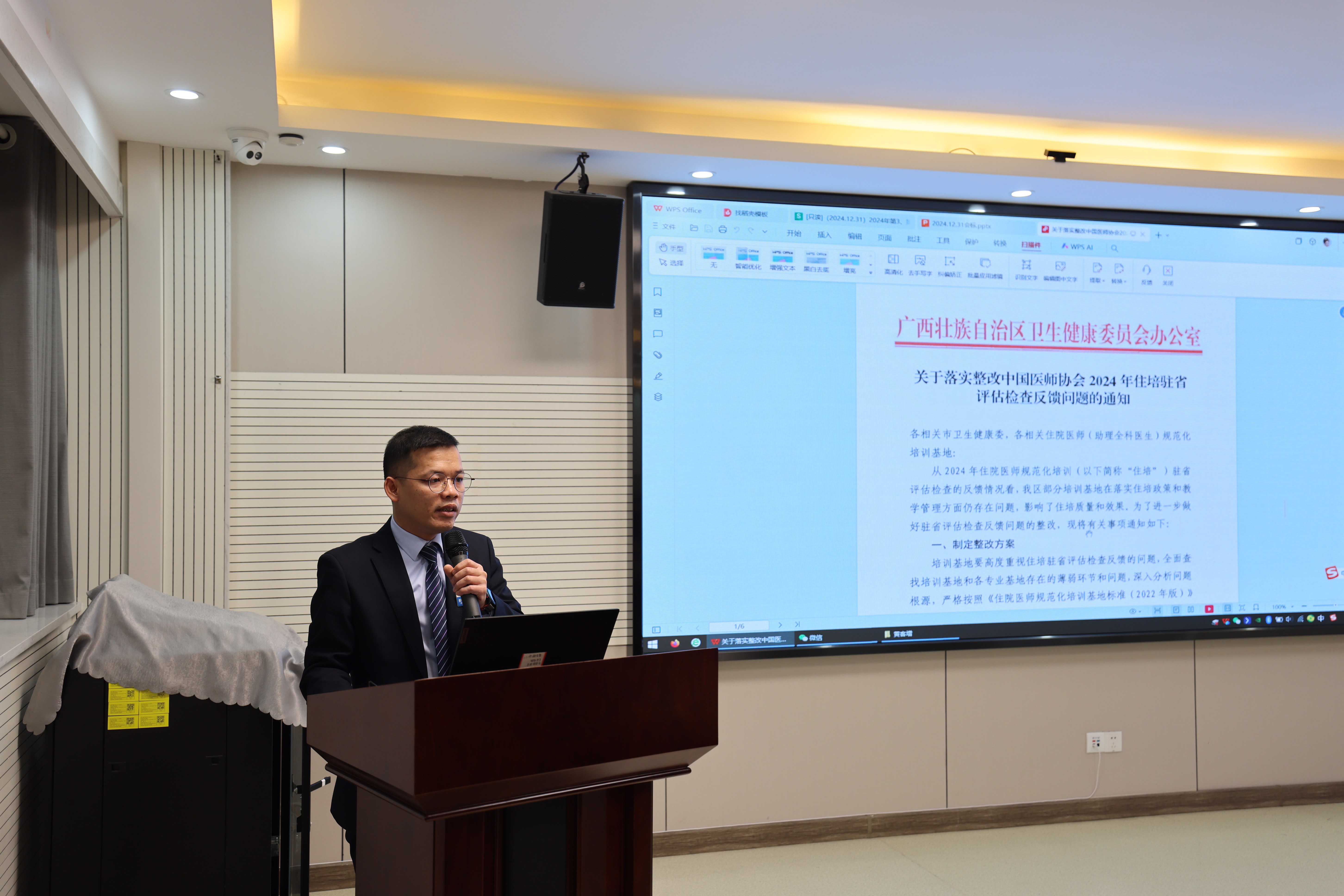会上,科研教学管理科科长黄客增详细传达了自治区科教工作会议精神,并对第四季度院级住培督导情况进行了全面通报。通过精准的数据与详实的案例,展示了住培工作中的成绩与不足,为后续改进指明了方向。同时强调各部门要严格按照中国医师协会2024年住培驻省评估检查反馈要求,扎实推进整改,按时上报整改情况,确保住培工作稳定有序发展。