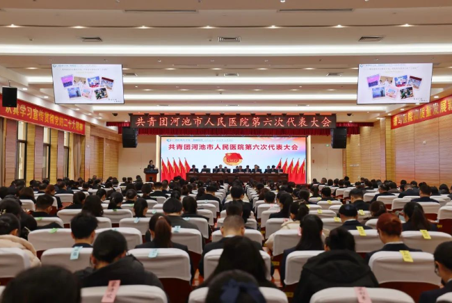 共青团河池市人民医院第六次代表大会开幕式在雄壮激昂的国歌声和青春洋溢的团歌声中开幕。会上,医院党委副书记、院长唐秀革宣读市直属机关团工委关于河池市人民医院团委换届选举的批复意见。