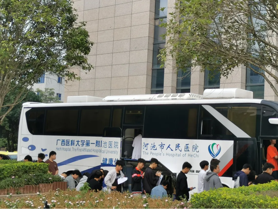 “贴近站直,好别动,吸气、呼气……”11月初,河池市人民医院组织了105名医务人员,把全长13米的体检车开进广西现代职业技术学院,2天完成了5000名新生体检。