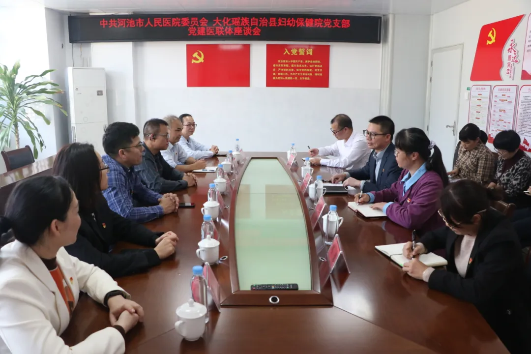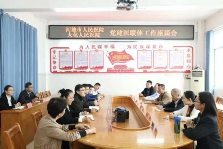当天上午,在大化瑶族自治县人民医院,该院副院长覃金浪在座谈会上介绍了医院的党建和业务情况,陆家承分享了河池市人民医院近年来党建与业务深度融合取得的明显成效。随后,双方就当前党建和业务发展的难点、业务技术提升、DRG及医保等工作进行了深入交流,表示下一步将深化党建医联体合作,加强业务水平与人才培养,提升服务水平,解决人民群众看病就医急难愁盼问题。