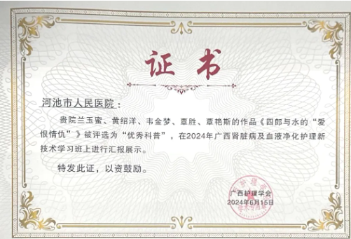 6月13日至15日,由广西护理学会举办的2024年广西肾脏病及血液净化护理新技术学习班暨学术年会在南宁召开。会议收到来自全区各医院推荐的科普作品共有31个,经专家审核后录用并进行现场展示13个。广西医科大学第一附属医院河池医院•河池市人民医院的科普作品《四郎与水的“爱恨情仇”》在31个作品中脱颖而出,获得“优秀科普作品”并进行现场展示。