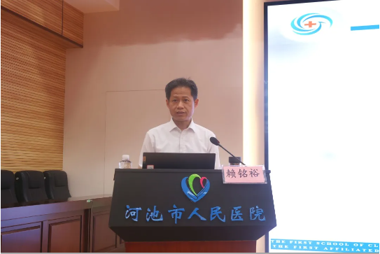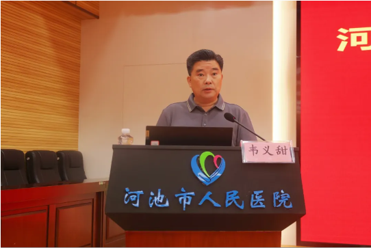 开班仪式上,河池市人民医院党委书记韦义甜在致辞中对广西医科大学第一附属医院专家团队的到来表示热烈的欢迎与衷心的感谢。他表示,医院以建设自治区级区域医疗中心为契机,不断深化合作共建内容,借力广西医科大学第一附属医院,学习住培工作的新理念、新举措和成功经验,进一步提升临床教学水平,有力提升住培工作内涵建设。
