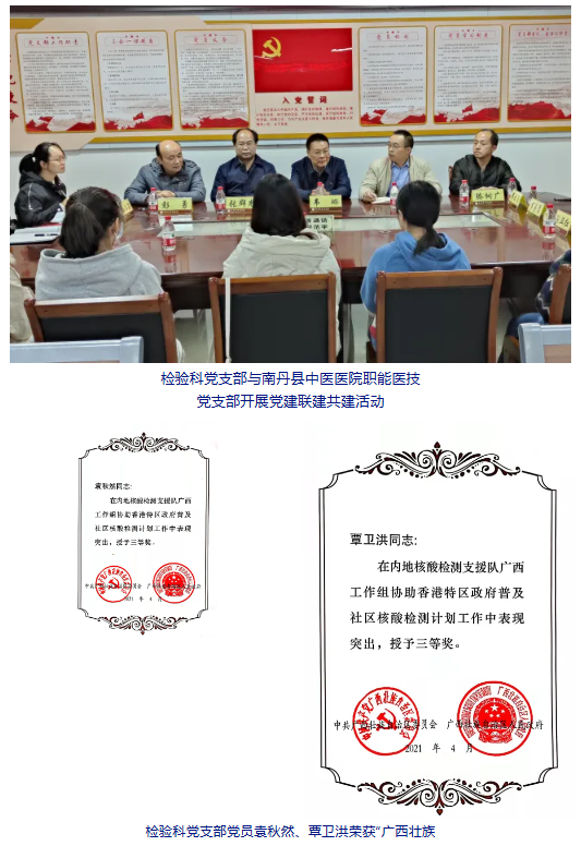 检验科党支部党员袁秋然、覃卫洪荣获“广西壮族自治区人民政府激励干部担当作为三等奖”;覃卫洪荣获共青团广西区委“向上向善·广西青年榜样”救死扶伤好榜样;受到贵阳市人民政府、新疆巴州库尔勒市、中共防城港市防城区委员会、中共钦州市钦南区委员会、凭祥市新冠肺炎疫情防控指挥部等表彰疫情防控先进个人38人次。