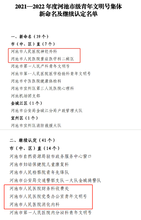 近日,河池市创建青年文明号活动组织委员会印发《关于命名和继续认定2021-2022年河池市级青年文明号集体的决定》,河池市人民医院新增2个市级“青年文明号”,3个集体顺利通过复核,继续被认定为“河池市青年文明号集体”。