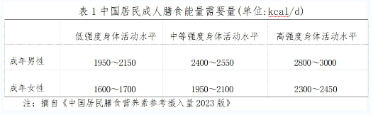 控制总能量摄入,可基于不同人群每天的能量需要量(表1),推荐每日能量摄入量平均降低30%~50%或降低500kcal~1000kcal,或推荐男性每日1200kcal~1500kcal、女性每日1000kcal~1200kcal的限能量平衡膳食。