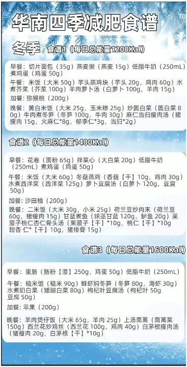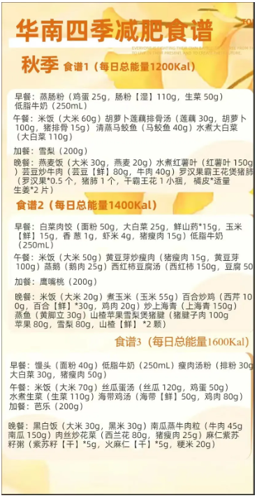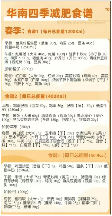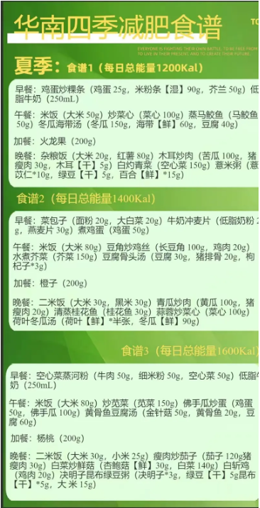 指南还结合各地食物资源和人群膳食特点设计了成人肥胖患者适用的全天食谱。每个地区、每个季节分别提供了1200kcal、1400kcal、1600kcal三个能量水平的食谱供参考。每个个体都可以根据自己的身高、体重和身体活动水平进行计算和调整,患者可以寻求医生或营养指导人员等专业人员的指导。华南地区(我区)1200kcal的四季食谱示例如下: