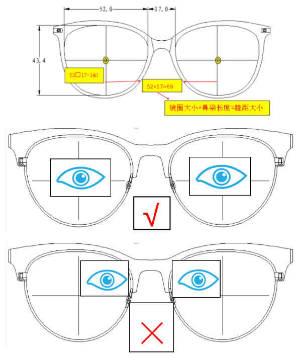 首先,先进行验光和测自己的瞳距。假如你的瞳距是69mm,那么你选择的镜架:镜圈大小+鼻梁长度约等于69mm,偏差不要大于6mm,这样才能确保你眼睛视轴中心与镜片中心一致。如下图,可参考来选择镜架。