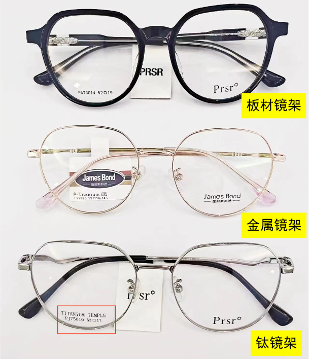 根据材质,眼镜架可以分为板材镜架、金属镜架和钛镜架。不同的材质做的镜架款式明显不同。金属和钛镜架眼镜框架边框比较细小,板材镜架边框比较宽(见下图)。