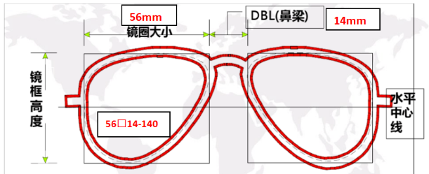我们看到这个镜架上写的这个56□14-140 ,这是镜架规格的表示方法——方框法,表示这副镜架镜圈大小56mm,鼻梁长14mm,镜腿长140mm。