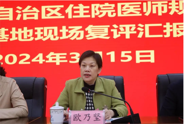 欧乃坚对专家组的到来表示欢迎和感谢,她表示,希望各位专家多提宝贵意见和建议,并要求医院相关部门配合好专家组的工作,按照专家组的要求立行立改,以此次复评为契机,加强住培工作,把医院住培工作推向新高度,不断提升住培质量,为河池市基层培养更多的医学人才。