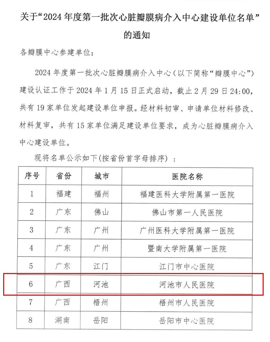 日前,国家放射与治疗临床医学研究中心、心血管健康联盟等单位公布了2024年度第一批次全国心脏瓣膜病介入中心建设单位名单,全国共有15家单位入选,河池市人民医院入选在列,成为河池市首家国家级“心脏瓣膜病介入中心建设单位”,标志着医院心脏瓣膜手术技术的发展,进入了新的阶段。