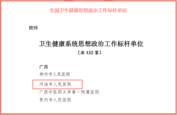 日前,中国卫生健康思想政治工作促进会印发了《关于卫生健康思想政治工作标杆单位培育选树情况的通报》,河池市人民医院获评“全国卫生健康思想政治工作标杆单位”,成为广西获评的4家医院之一!