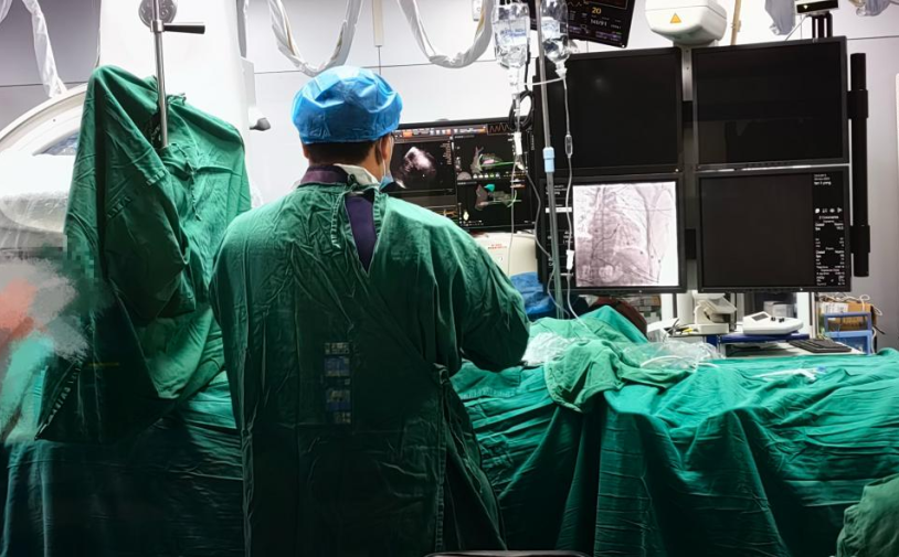 术中,医院党委副书记、院长唐秀革主任医师和心血管内科二病区主任梁承院副主任医师联合多学科团队为谭先生进行在ICE指导下梗阻性肥厚型心肌病室间隔射频消融术。