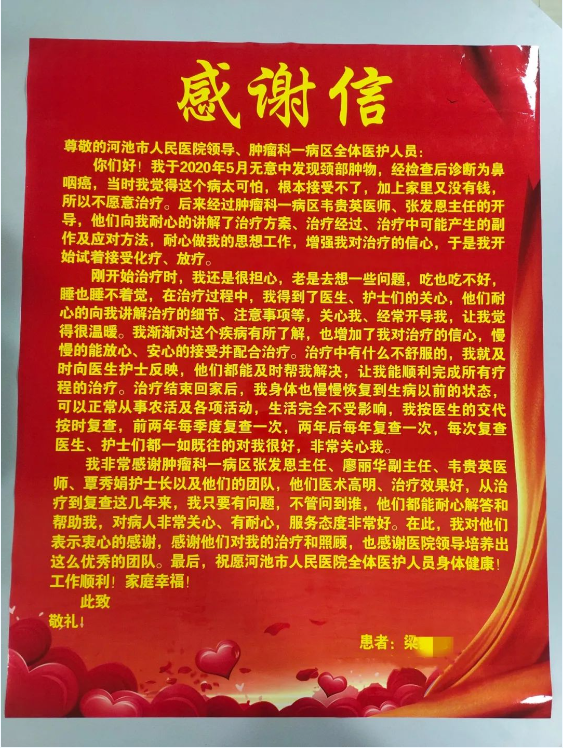 “从治疗到复查这几年来,我只要有问题,不管问到谁,他们都能耐心解答和帮助我,对病人非常关心、有耐心,服务态度非常好……”近日,河池市人民医院肿瘤科一病区收到了一面锦旗和一封写得满满当当的感谢信。