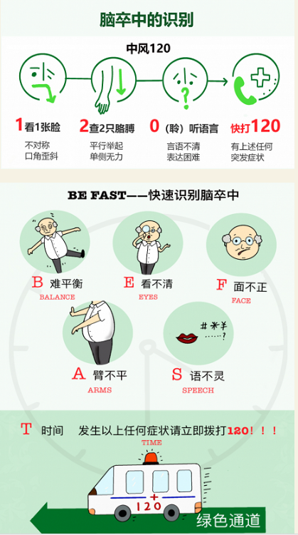 若发病时间在4.5-6小时之内,仍可以选择尿激酶静脉溶栓。如果经过医生检查发现患者为大血管闭塞,排除禁忌后,还可以进行动脉取栓治疗。说了这么多,那我们如何做到早期识别中风症状呢?