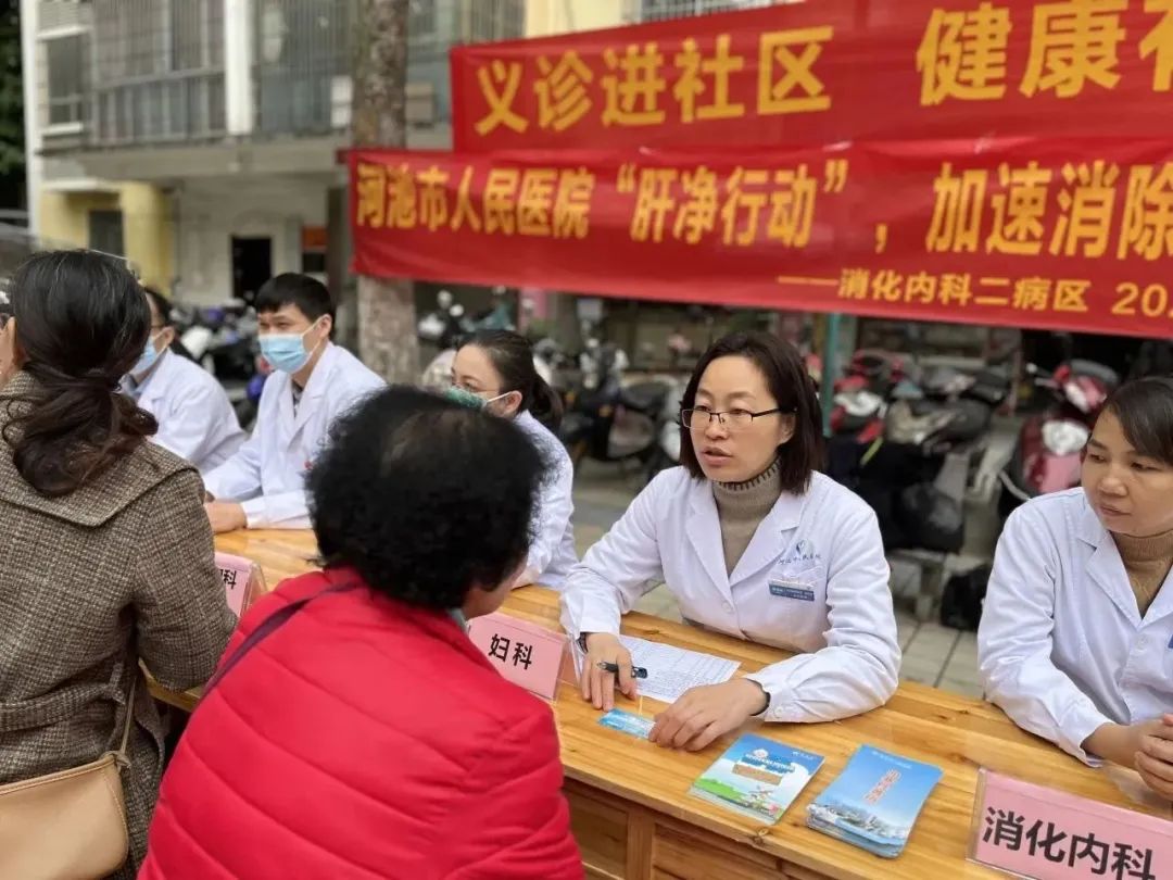 河池市人民医院消化内科党支部联合妇产生殖党支部、感染性疾病科党支部、心血管内科党支部等相关党支部医护专家团队到金城江区东江镇加辽社区加辽大屯文化室开展“肝净行动 加速消除丙肝危害”的义诊活动。