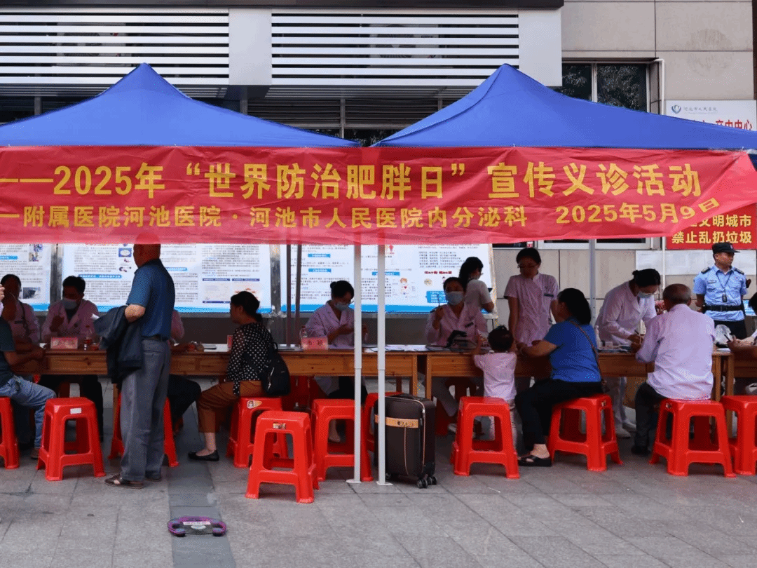 5月11日是“世界防治肥胖日”,今年的主题是“健康体重,一起行动”。为提高公众对肥胖症的认知和防治意识,5月9日上午,广西医科大学第一附属医院河池医院·河池市人民医院内分泌科联合临床营养科、体检科、康复医学科、呼吸与危重症医学科、心血管内科、消化内科、肾内科等科室及糖尿病护理专科小组在总部院区门诊大楼前开展2025年“世界防治肥胖日”义诊活动,旨在提升公众对肥胖症的科学认知和防治能力。