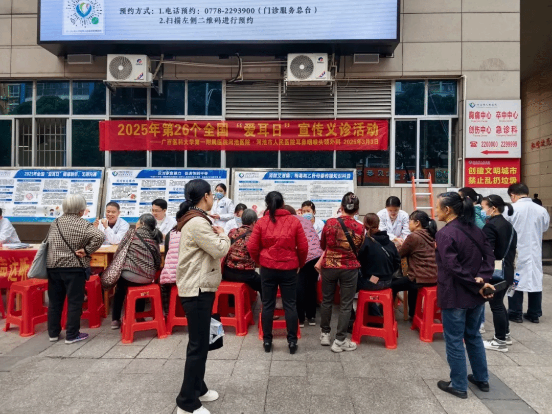2025年3月3日是第26个全国“爱耳日”,为提升公众对耳部健康的重视,促进健康生活的普及,当天上午,广西医科大学第一附属医院河池医院·河池市人民医院耳鼻咽喉头颈外科联合眼科、口腔科、儿科、体检科在门诊综合大楼前开展“全国爱耳日”宣传义诊活动。