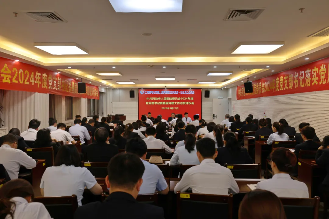 3月25日下午,广西医科大学第一附属医院河池医院·河池市人民医院召开2024年度党支部书记抓基层党建工作述职评议会。市卫生健康委党组成员、副主任刘仁高,市防艾中心主任施远陆到会指导,河池市人民医院领导班子成员、党委委员、纪委委员、各党支部委员、基层党员和群众代表、医院两代表一委员等140余人参加会议。
