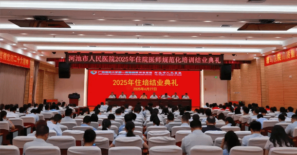 6月27日下午,广西医科大学第一附属医院河池医院・河池市人民医院在教学综合楼5楼学术报告厅举办2025年住院医师规范化培训(以下简称“住培”)结业典礼。河池市卫生健康委副主任、市中医药管理局局长欧乃坚,医院领导班子成员出席。全院中层干部、2022级全体住培人员(含并轨专硕)、科研教学管理科成员、各专业基地相关负责人及指导医师参会。