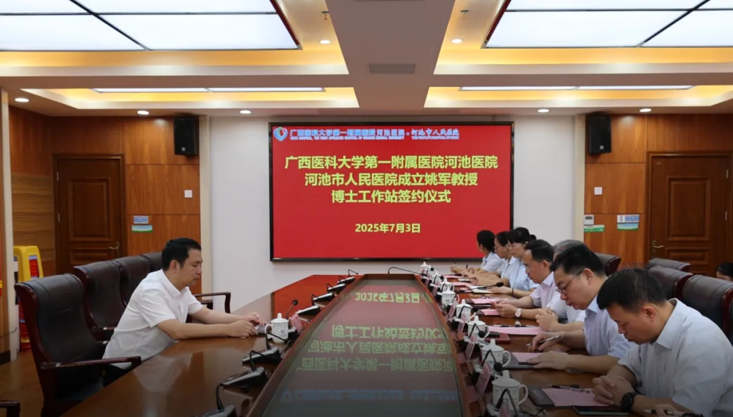 7月3日,河池市人民医院与广西医科大学第一附属医院姚军博士团队在教学综合楼7楼党员活动室举行关节外科博士工作站签约仪式,标志着医院在高层次骨科人才引进和培养迈出关键一步,也为自治区级区域医疗中心建设注入新动能。河池市人民医院党委副书记、院长唐秀革等院领导班子成员、各职能科室负责人及关节外科业务骨干共同参会,医院党委委员、副院长蒙如庆主持仪式。