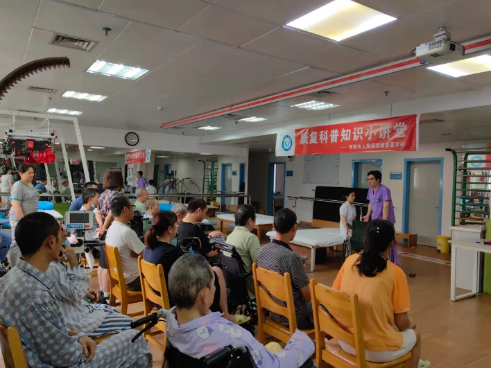 近日,河池市人民医院康复医学科在治疗训练大厅开展康复知识小讲堂,由康复医学科医师、治疗师和护理人员为康复医学科患者及家属授课讲解。