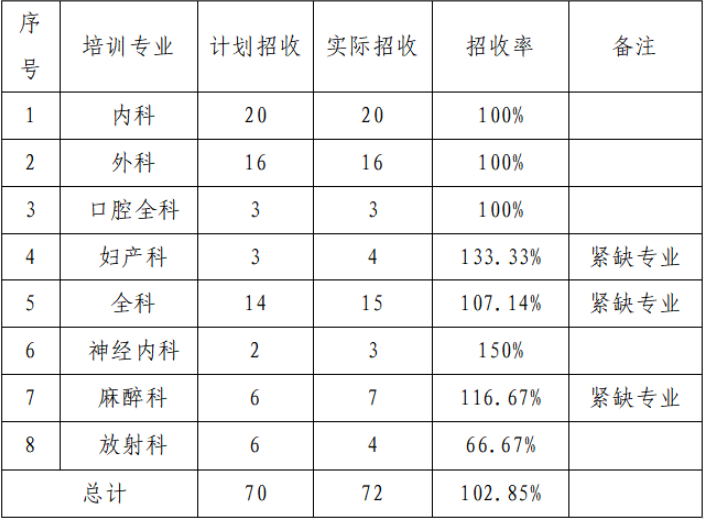 (1)根据医院规范化培训基地各专业基地综合情况,结合目前各专业基地近几年招生情况,在不超过各专业基地学员总容量的情况下:2023年共招收国家住院医师规范化培训学员72名(其中社会学员53人,其他单位委培学员19人,其中全科专业订单定向15人),详见下表: