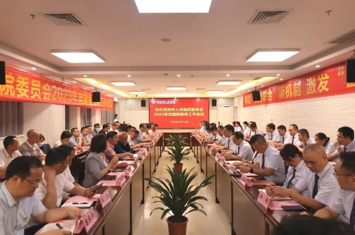 为进一步推进党建医联体建设,促进各成员单位深度融合交流,5月16日下午,河池市人民医院在教学综合楼5楼多功能会议室召开党建医联体工作推进会议。市卫生健康委党组书记、主任谢君理出席会议并讲话,全市11个县(区)及贵州省荔波县人民医院共计38家医联体成员单位党政主要领导及相关科室负责人等100余人参会。会议由河池市卫健委党组成员、医院院长唐秀革主持。