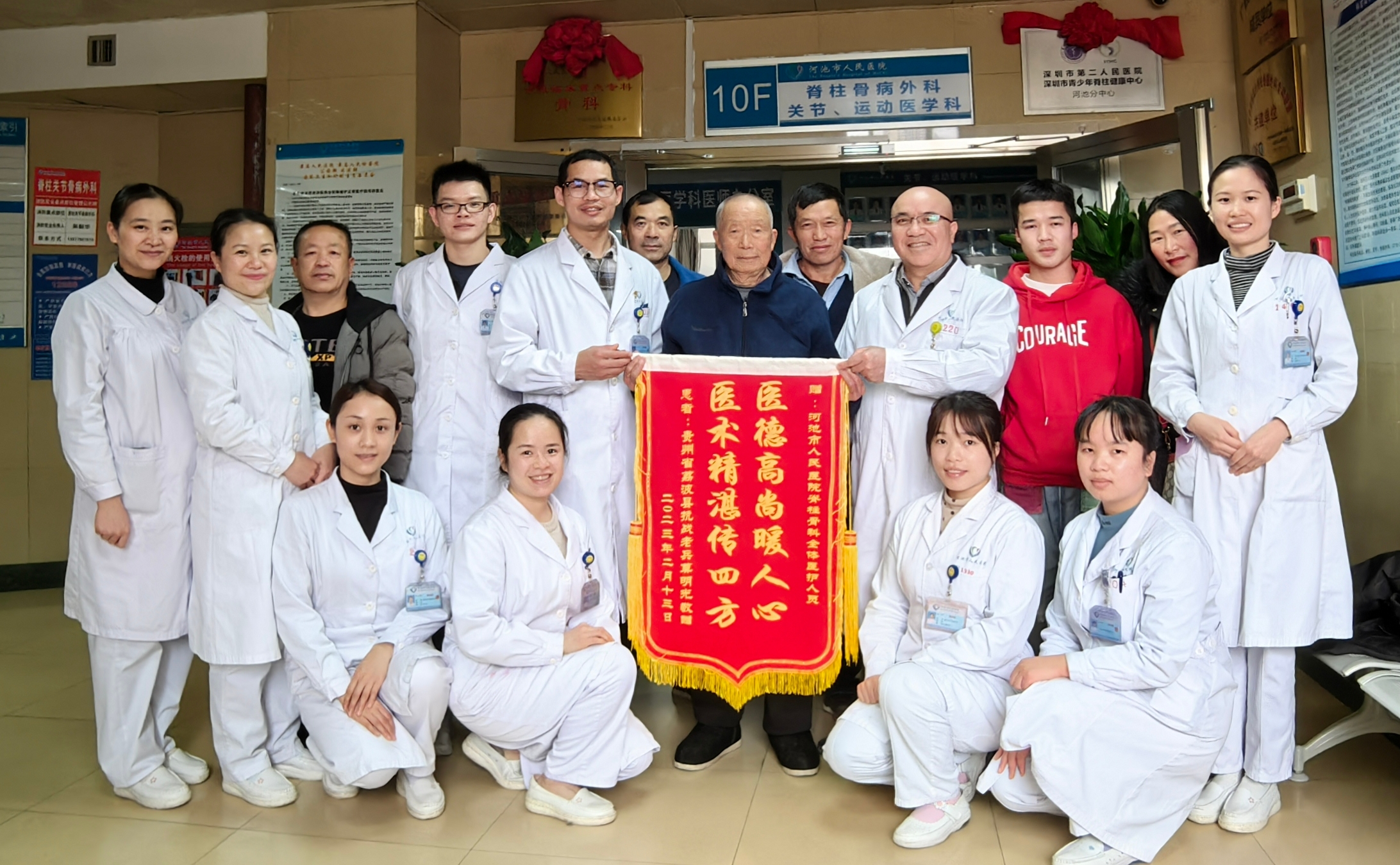 “这几天好很多了,感谢你们的治疗和照顾”。2月13日,在河池市人民医院脊柱骨病外科的病房里,一位91岁的抗美援朝老兵——莫大爷,徐徐向前,将一面锦旗送到医护人员手中,描述着自己的治疗感受,并向医护人员致以诚挚的谢意。