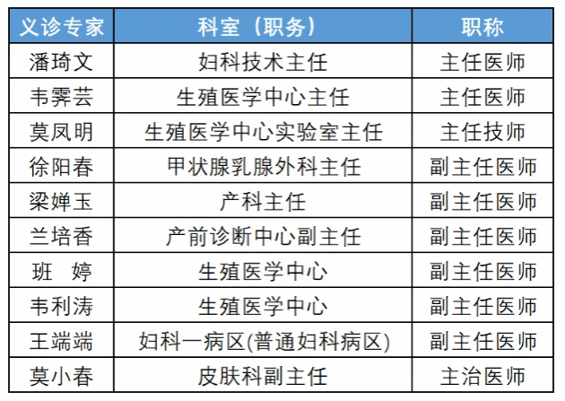 (一)专家义诊:为现场群众义诊,包括孕前、孕期保健咨询、分娩相关咨询以及产后康复指导;妇科常见病预防及治疗的咨询和指导;备孕夫妻、高龄女性、反复流产患者等提供免费生殖健康评估与生育力咨询和指导;甲状腺乳腺疾病预防及治疗的咨询和指导,免费超声检查;常见皮肤病咨询、女性皮肤问题指导和皮肤美容与护理指导等。