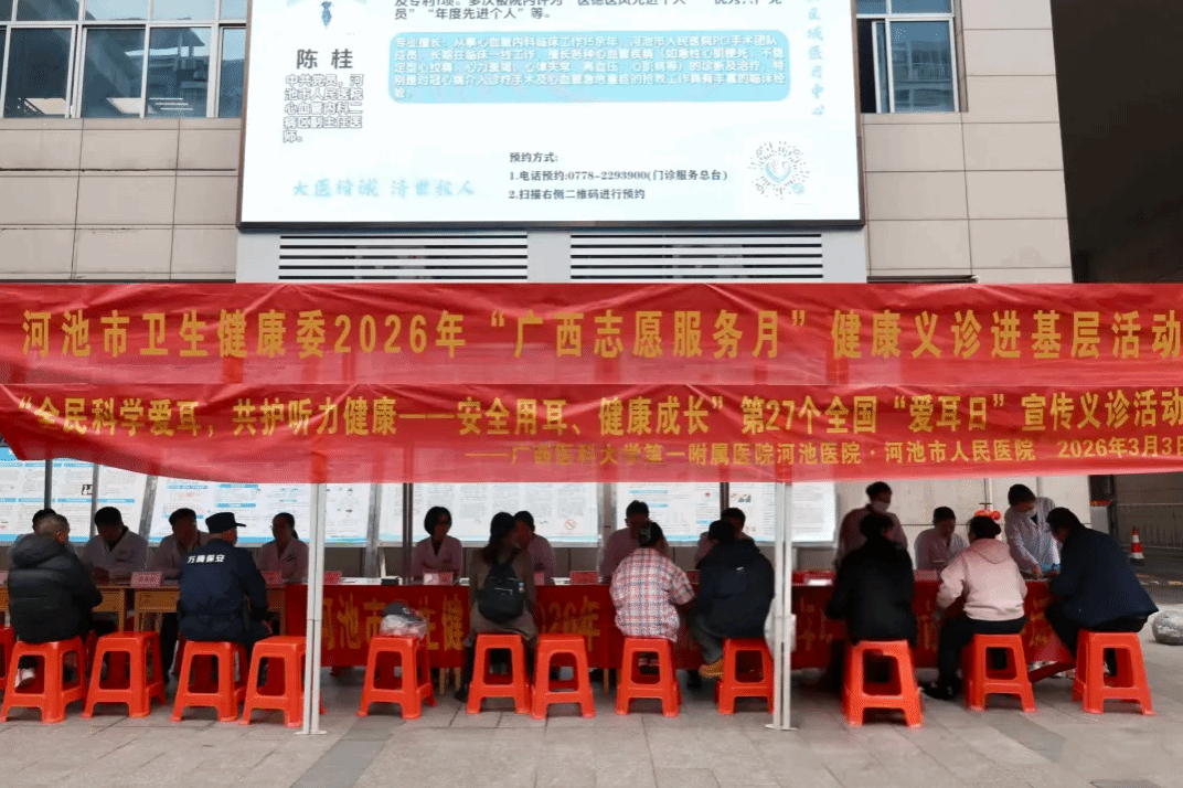 为大力弘扬雷锋精神,普及听力健康知识,倡导全生命周期听力健康管理理念,3月3日上午,河池市卫生健康委与广西医科大学第一附属医院河池医院·河池市人民医院联合,开展2026年“3·5”学雷锋纪念日和广西志愿服务月主题志愿服务活动暨“全民科学爱耳 共护听力健康”第27个全国“爱耳日”义诊志愿服务活动。医院耳鼻咽喉头颈外科联合体检科、眼科、口腔科、儿科、儿童康复科、创伤手外科、心血管内科、全科医疗科以实际行动践行志愿服务精神,为群众送上健康关怀。