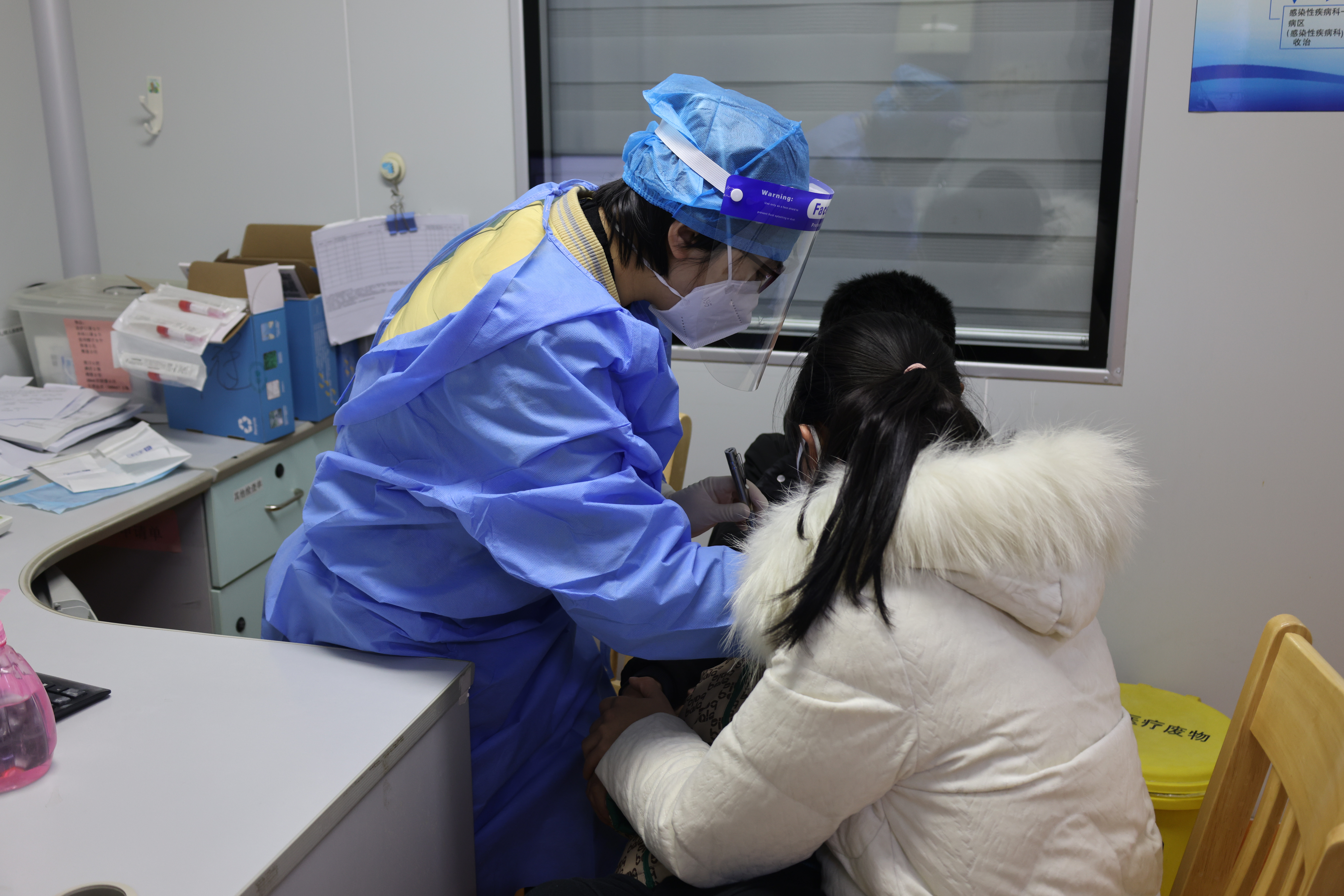 “来,a~让阿姨看看你的小嘴。”黎春明医生在儿童发热门诊耐心地给患儿做检查,往近一看,发现防护面罩下是黎医生烧红了的脸。