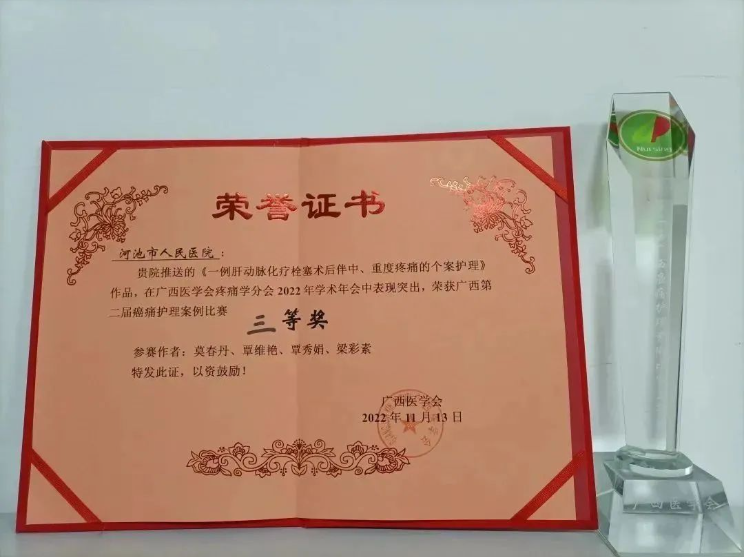 11月11日-13日,广西医学会疼痛分会在南宁举办MDT模式下癌痛全程精细化管理学习班暨广西第二届癌痛护理案例比赛,河池市人民医院肿瘤科一病区团队在本次比赛中荣获三等奖。