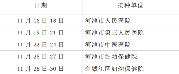 根据河池市金城江区新冠病毒疫苗接种工作专班安排,2022年11月16日至11月30日新冠疫苗接种安排如下,请各位民众根据需求选择新冠疫苗接种点接种。