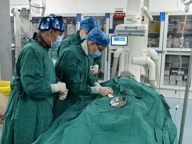 病情的进展让韦爷爷逐渐出现意识丧失,重症医学科一病区主任刘涉泱及其救治团队迅速响应协助抢救,在短时间内完成了气管插管、深静脉穿刺、补液抗休克等有效处理,以稳定生命体征并保护重要脏器功能,避免脏器进一步受损,同时积极为下一步的急诊手术创造时机。患者出血量大,休克越来越重,缺血的打击让全身的重要脏器经受着严峻的考验,莫昌干果断决定,为患者紧急实施“腹主动脉球囊阻断术+腹主动脉覆膜支架腔内隔绝术”。手术团队立即开通绿色通道,介入导管室迅速完成术准备,病人第一时间被送至手术室。术中可见巨大腹主动脉瘤,局部见造影剂外渗,瘤颈扭曲,手术难度大。术中患者一度出现了血压及心率的持续下降,手术团队操作娴熟,配合默契,一方面予腹主动脉球囊阻断血流维持了患者血压的稳定,一方面快速精准地置入了腹主动脉覆膜支架,及时封堵了破口,两个小时后,手术顺利结束,韦爷爷破裂的腹主动脉披上了“金丝软甲”。